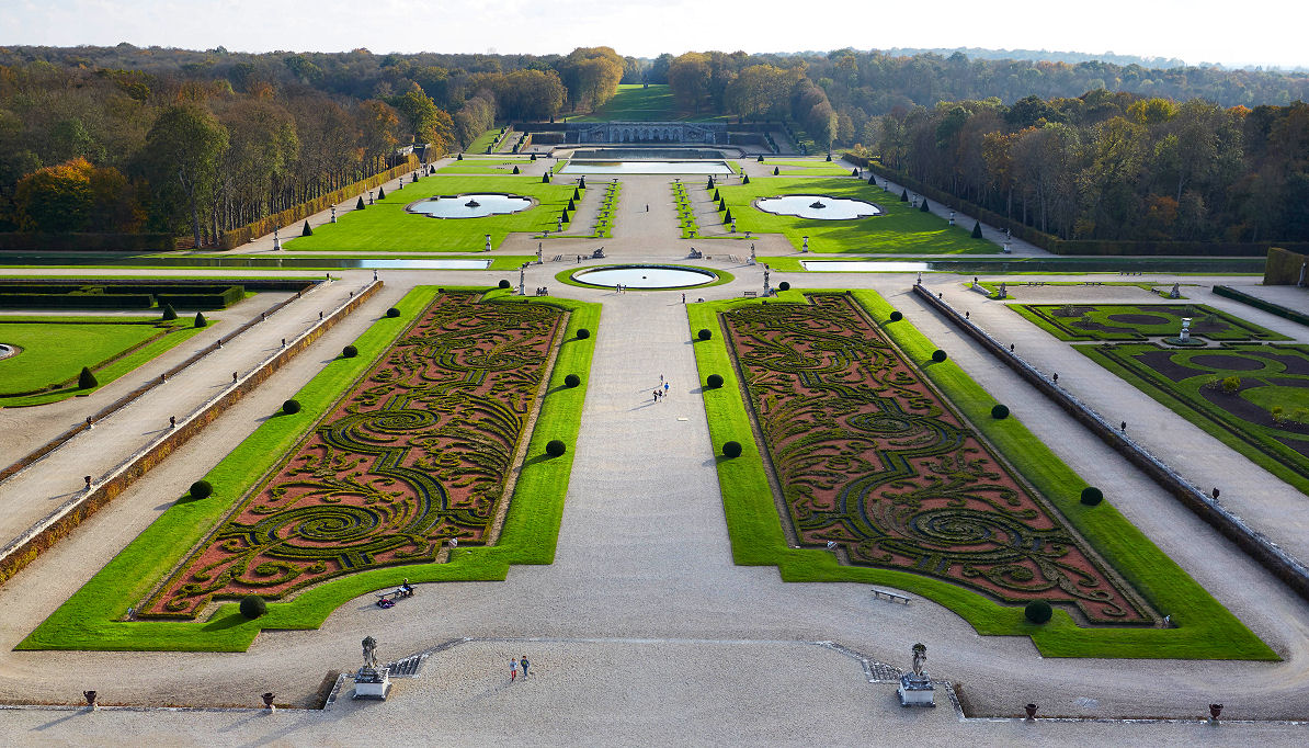 Y si el edificio fue novedoso a mediados del siglo XVII, más aún lo fueron sus jardines caracterizados por la racionalización de los paseos rectos con parterres que parecen cuidadosamente “bordados” en contraste con la masa de árboles aparentemente salvajes que los delimitan. Jardines que por sus grandes dimensiones fueron concebidos más para ser admirados desde las ventanas del palacio que para ser paseados.