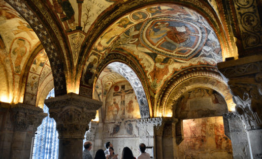 Con todo, la maravilla de las maravillas está muy cerca, a los pies de la iglesia: el panteón. En un cuadrado de solo 8 metros de lado, docenas de pinturas al temple (dicen los expertos que no hay que confundirlas con los frescos) recubren la totalidad de techos y muros.