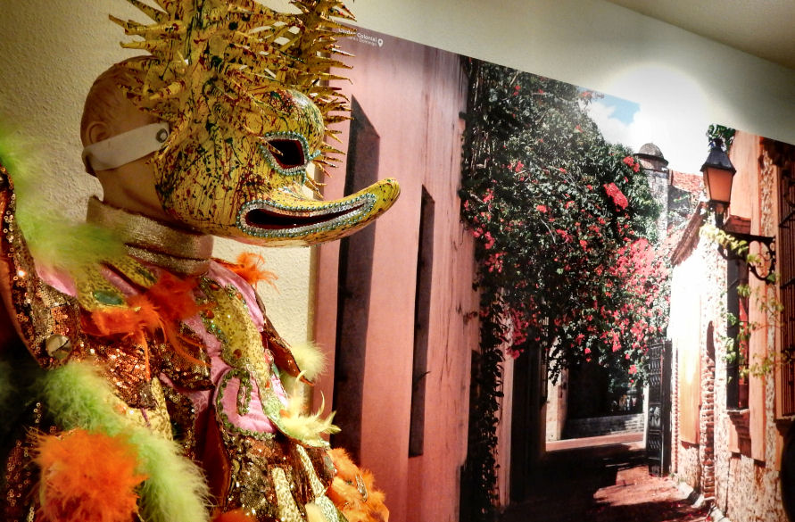 Disfraz carnavalesco de Diablo Cojuelo junto a una foto de Santo Domingo en la Oficina de Turismo dominicana en Madrid. (Foto: Pilar Arcos).