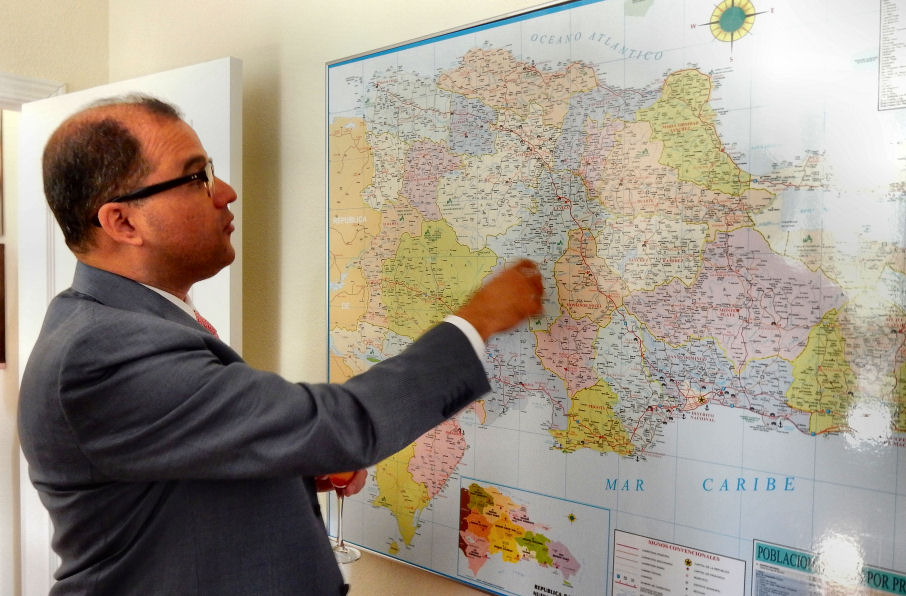 El embajador señala puntos turísticos sobre un mapa de la República Dominicana. (Foto: Pilar Arcos).