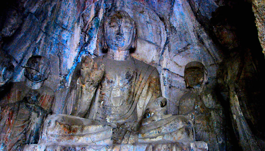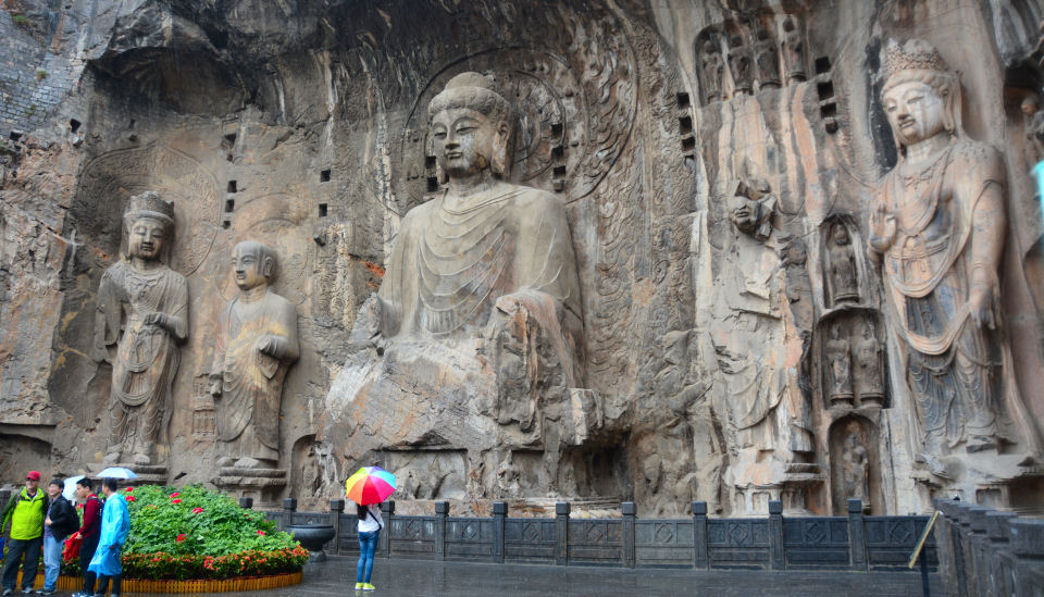 La estatua situada en el centro, la mayor de Longmen, tiene 17 metros de altura y representa al Buda histórico, flanqueda por dos de sus discÃpulos: Ananda y Kashpaya.