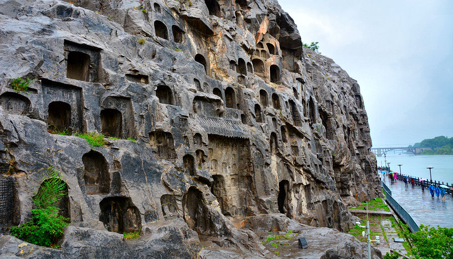 Situadas a 15 kilómetros de la ciudad, en un acantilado sobre el río Yi, miles de cuevas de diversos tamaños se extienden sobre un kilómetro de ribera. Han sido catalogadas 2.345 grutas y nichos con 2.800 inscripciones, 40 pagodas y unas mil figuras de Buda. Declaradas Patrimonio de la Humanidad en 2000, son junto a las de Mogao (provincia de Gansu) y las de Yungang (Shanxi), las grutas budistas más importantes de toda China.