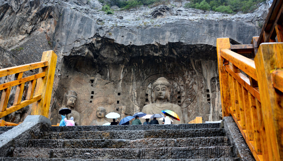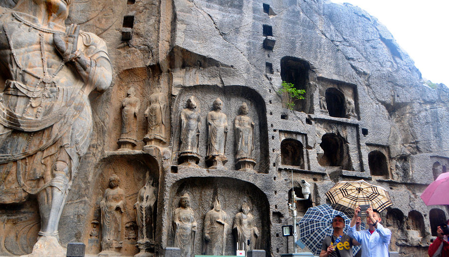 Una de las cuevas más antiguas es la de Binyang, comenzada a escavar en el 508. Está compuesta por un gran número de tallas originalmente pintadas en azul brillante, rojo, ocre y oro, aunque la mayor parte de la pintura ha desaparecido. El Buda central, sentado en un trono de león, es generalmente identificado como Sakyamuni.