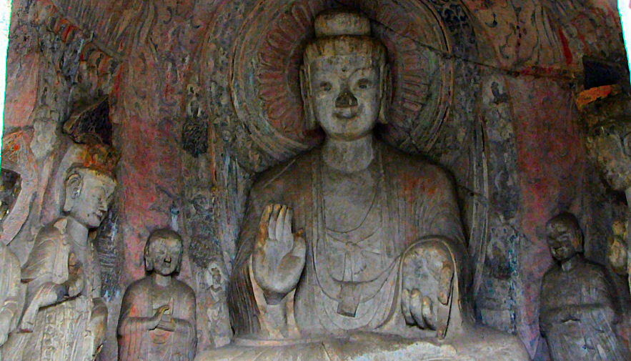 La estatua situada en el centro, la mayor de Longmen, tiene 17 metros de altura y representa al Buda histórico, flanqueda por dos de sus discípulos: Ananda y Kashpaya.