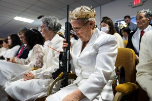 En esta ceremonia, Tim Elder, director de misiones mundiales del Santuario de Unificación santificó los matrimonios de las parejas que acudieron con sus armas, a las que llegó a denominar “indumentaria religiosa“.
