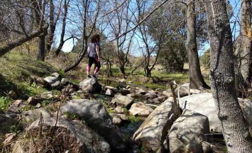 El primer tramo es el más seco, una senda que es una herida entre las encinas. En los laterales se entremezclan rocas de gran tamaño y jara en abundancia, que suele florecer entre abril y mayo, quizá los mejores meses para poner rumbo a este pueblo, cuando el cauce del río aún resuena como una dulce melodía. En un punto señalizado trepa hacia el cielo una encina de gran tamaño, con doce metros de copa, árbol singular de la Comunidad de Madrid, inconfundible consu forma de seta. Tiene unos 150 años de vida. Y unos minutos después, llega el primer «descansadero», punto con pasto y agua, combinación vital en la trashumancia. Nos encontramos con el río, y con un puente de piedra. A partir de ahí, el cauce nos acompañará en todo momento.