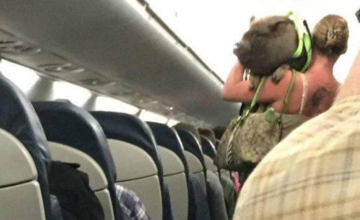 Los pasajeros de la compañía US Airways se debieron quedar perplejos. Fue a las seis de la mañana del miércoles 26 de noviembre, en el Bradley International Airport (condado de Hartford, Connecticut, Estados Unidos). Una mujer subió al avión con un cerdo vietnamita barrigón. Lo llevaba a hombros, con un lazo verde a juego con su bolso. Se dirigió a su asiento, justo al lado del de Jonathan Skolnik, profesor de la Universidad de Massachusetts-Amherst, quien, incrédulo, tecleó un correo electrónico al periódico local, The Courant, para contar la historia. Mientras tanto, otro pasajero, Rob Phelps, levantó su móvil y tomó la foto que ilustra estas líneas, y que estos días ha circulado abundantemente por internet.