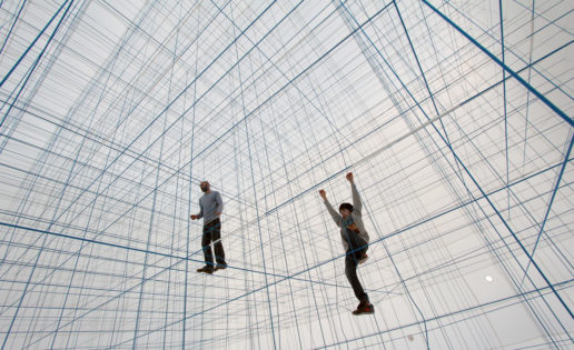 Las imágenes lo dicen todo. Estamos ante la última obra de Numen, un estudio de diseño medio austriaco medio croata, con sede en Viena, que podría se una instalación artística o un gimnasio «cool», según como se mire. Este cubo cruzado por cuerdas es por ahora un prototipo que, cuando se comercialice, todos quisiéramos tener en el jardín. Primero para mirar. Luego, para trepar y disfrutar como un niño. Tiene 32 metros de altura por veinte de ancho, y las cuerdas, muy sólidas, cruzan de un lado a otro hasta formar un enorme laberinto aparentemente sin final, logrado con un peculiar juego de luces. En este vídeo se ve cómo se ha creado la instalación.