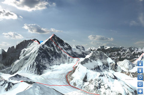 Justo cuando la leyenda de Hillary vuelve a asomar en la memoria, y cuando Juanjo Garra se ha quedado en el cielo del Dhaulagiri, una compañía alemana acaba de lanzar una aplicación para ver el Everest en 3D sin ningún riesgo, en la tableta o en el móvil, con una calidad de imagen asombrosa. Podemos observar el Everest desde cualquier ángulo y navegar por la zona con el dedo, como estamos acostumbrados.