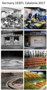 Le debo a un gran amigo el envío por WhatsApp de esta composición fotográfica que creo que habla por sí sola. Cada foto de actos del nazismo es comparada con otra semejante del separatismo catalán. El paralelismo es sobrecogedor. Es cierto que no parece imaginable que el secesionista catalán acabe en genocidio de los catalanes no independentistas. Pero que el final de la película no sea el mismo no significa que ambos movimientos totalitarios no empleen la misma metodología.