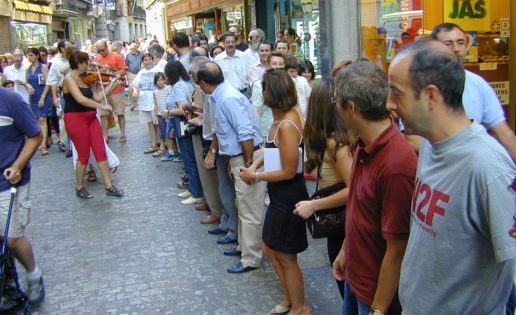 Fue un acontecimiento sorprendente y emocionante, aquella cadena humana que se formó el 22 de agosto de 2000 y en la que participaron cientos de toledanos para ir pasándose de mano en mano el libro «La Historia de Toledo», de Martín Gamero, al son de la música de un grupo de violines. La cadena de este verano arranca desde la propia librería a la Plaza del Ayuntamiento, donde se celebra el festival poético Voix Vives. Cada eslabón de la cadena, cada lector, llevará un libro y todos, al unísono, leerán la parte que deseen, uniendo sus voces en un sonoro homenaje al libro. «Hace catorce años ni nosotros mismos nos esperábamos la de gente que quiso formar parte de la cadena, en pleno mes de agosto; fuimos pasando el libro de mano en mano, por toda la calle Comercio, y la persona que lo puso en las estanterías vacías fue el dramaturgo Antonio Ballesteros», cuenta la librera Petri Díaz-Ropero, propietaria de un local que en 1989 fue bautizado con el nombre de «Fuenteovejuna» y que ahora, sobrepasada con creces la mayoría de edad, todos conocen como «Hojablanca», ese papel inmaculado por donde acecha la imaginación.