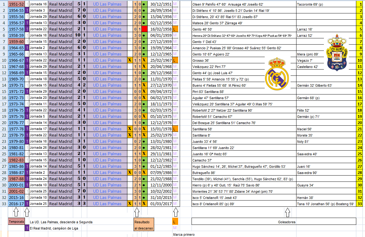 El Real Madrid ha ganado 28 veces de las 33 que se enfrentó a la UD. Las Palmas en el Bernabéu en Liga. Los cuatro primeros empates fueron con el mismo marcador: 1-1. Y el año pasado, trepidante 3-3. Las cinco veces que los canarios han puntuado en Chamartín, los blancos fueron campeones. Solo una vez llegaron los visitantes ganando al descanso (remontó 2-1 en la 57-58) y solo tres veces se adelantaron los canarios en el marcador. 2-1 es el resultado que más veces (cinco) se ha repetido.