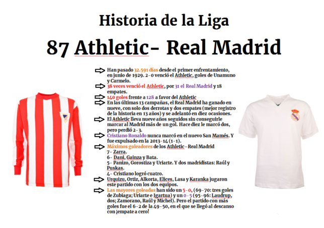 El Athletic ha derrotado 38 veces como local al Real Madrid en la historia de la Liga, por 31 victorias de su rival y 18 empates. En las últimas 13 campañas, los blancos han ganado en nueve, con dos derrotas y dos empates (mejor registro en un lapso así) y se adelantó en diez ocasiones. Cinco de estos nueve últimos triunfos madridistas fueron además por tres goles de diferencia. Será el sexto partido en el nuevo San Mamés, donde nunca pudo marcar un gol Cristiano Ronaldo, máximo artillero de la historia blanca. El portugués además fue expulsado en la 2013-14.