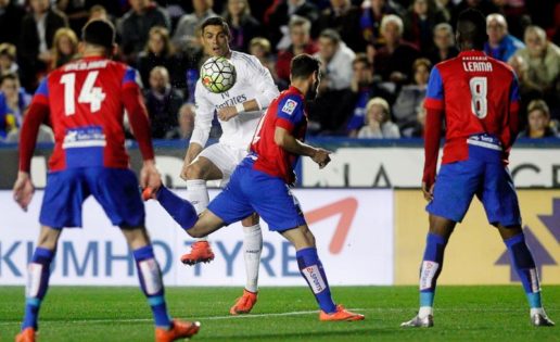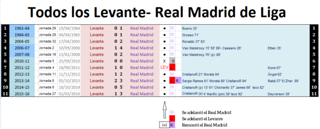 La última visita del Real Madrid fue hace dos campañas, antes del descenso de los granotas, 1-3 ganó el Madrid, en jornada de miércoles y partido gris. Zidane había sustituido a Benítez dos meses antes, pero la derrota ante el Atlético la jornada anterior había hecho saltar las alarmas. El Barça le sacaba 12 puntos y el Villarreal, cuarto, estaba a solo dos. El Madrid viajó con muchas bajas: Carvajal, Ramos, Marcelo, Bale, Benzema y Modric no estaban. Zidane dejó a Isco en el banquillo y alineó a Lucas Vázquez, que resultó el mejor; forzó el penalti por zancadilla que marcó CR7 (su gol 23 en el campeonato). Fue el primer partido titular de Borja Mayoral, entonces en el Castilla y en el equipo juvenil de la Youth Champions. Marcó un gol que le dieron a Mariño en propia meta (el balón rebotó en el poste y dio en la pierna y cuerpo del portero). Curiosa fue la anécdota de Mayoral intentando convencer al árbitro en el descanso –así lo reconoció en declaraciones a la COPE- de que le diese a él el gol. Jugó Casemiro de inicio, que no lo estaba haciendo desde que se había ido Benítez. El Levante tuvo el 2-2, sin apenas hacer nada, en un córner, pero se le fue la opción. Isco en la prolongación marcó el 1-3; era su segundo gol de la Liga en la jornada 27. Como en esta semana, también el Madrid de basket perdió con el CSKA Moscú en la Euroliga.