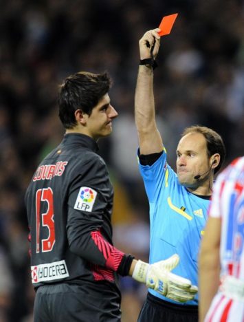 Courtois podrá estar en otro derbi. Jugó su primero en el Bernabéu en la 2011-12. Se adelantó Adrián 0-1 y el portero belga cometió penalti sobre Benzema y fue expulsado a los 24 minutos. Lo marcó Cristiano (que transformó otro penalti, con expulsión de GodÃn, para cerrar la cuenta, tras los goles de Di MarÃa e HiguaÃn).