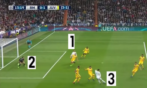 Cristiano Ronaldo (jugador 3) chuta. Isco (jugador 1) se encuentra en posición adelantada de fuera de juego. Isco no interviene ni hace por intervenir. Buffon (jugador 2) para y despeja y en ese rechace (una salvada dice el reglamento) Isco se hace con el balón (aprovechándose de su situación adelantada en el momento del disparo de Cristiano). Isco juega el balón y es entonces cuando es fuera de juego, que se produjo en el momento del chut de Cristiano y que no se habÃa consumado como acción ilegal hasta que Isco no hizo por jugar. Si el disparo de Cristiano hubiese sido gol, Isco hubiera estado en fuera de juego posicional y la acción hubiera sido legal. Si cualquier defensor de la imagen hubiera despejado e introducido el balón en su propia meta, Isco hubiera estado en fuera de juego posicional y el gol hubiera sido legal. Pero la jugada es fuera de juego, al intervenir Isco ganando ventaja en la posición que tenÃa adelantada al disparar Cristiano.