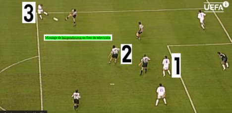 Roberto Carlos (jugador 3) centra. Mijatovic (jugador 1) se encuentra en posición adelantada de fuera de juego. Mijatovic no interviene ni hace por intervenir. Iuliano (jugador 2) despeja y en ese rechace (una salvada dice el reglamento) Mijatovic se hace con el balón (aprovechándose de su situación adelantada en el momento del pase de Roberto Carlos). Mijatovic juega el balón y es entonces cuando es fuera de juego, que se produjo en el momento del centro chut de Roberto Carlos y que no se habÃa consumado como acción ilegal hasta que Mijatovic no hizo por jugar. Si el centro de Roberto Carlos hubiese sido gol, Mijatovic hubiera estado en fuera de juego posicional y la acción hubiera sido legal. Si Iuliano en el despeje hubiera introducido el balón en su propia meta, Mijatovic hubiera estado en fuera de juego posicional y el gol hubiera sido legal. Pero la jugada es fuera de juego, al intervenir Mijatovic ganando ventaja en la posición que tenÃa adelantada al centrar Roberto Carlos (*).