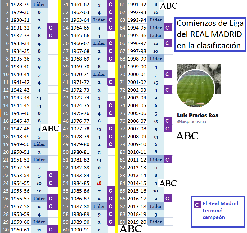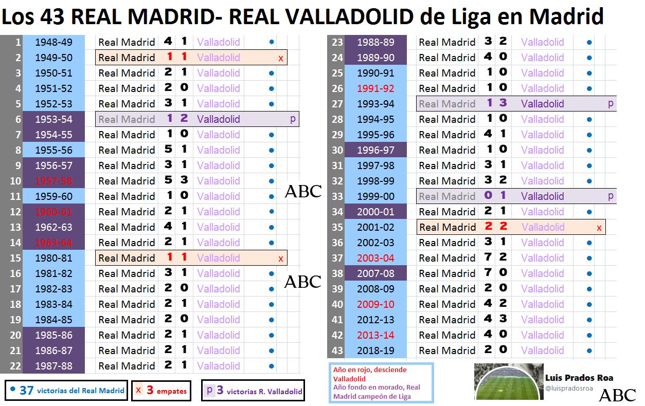 El Real Madrid recibirá al Real Valladolid por 44ª vez en la historia de la Liga, con 37 victorias locales (86,05%), tres empates y tres derrotas en los antecedentes. 111 por 41 goles para los locales. Ocho visitas consecutivas llevan los visitantes sin puntuar. Comienza el Real Madrid líder. 16 veces empezó la Liga en el primer puesto, de las que en seis de ellas terminó siendo campeón. Llevan los madridistas 11 temporadas sin perder en una primera jornada (16 campañas es el récord, las que fueron desde 1961 a 1977).