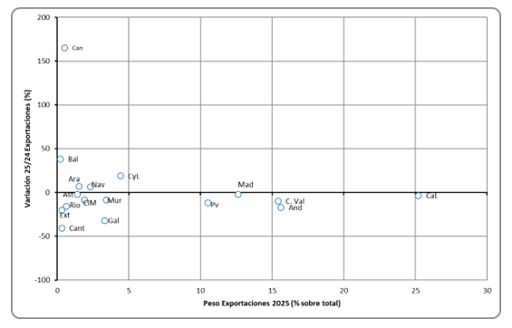 En un análisis básico a nivel regional, la estructura exportadora hacia EE. UU. sigue muy concentrada en 2025: Cataluña (25,2% del total), Andalucía (15,6%), Comunidad Valenciana (15,4%), Madrid (12,6%) y País Vasco (10,5%) reúnen cerca del 79% de las ventas. Sin embargo, el rasgo dominante en 2025 es que buena parte de esas comunidades de mayor peso se sitúan en terreno contractivo. Andalucía (-16,9%), Comunidad Valenciana (-9,7%), País Vasco (-11,7%) y Cataluña (-3,4%) explican la mayor parte del descenso agregado; Galicia (-32,0%), con menor cuota (3,3%), también resta de forma apreciable. Frente a ello, los avances de Castilla y León (+19,2%), Navarra (+6,5%) o Aragón (+7,1%) son relevantes, pero insuficientes para compensar el retroceso de los grandes polos exportadores. Canarias (+165,1%) y Baleares (+38,5%) aparecen como atípicos positivos, aunque con un peso muy reducido, por lo que su impacto macro es limitado. En suma, como sugiere el gráfico de dispersión de exportaciones, el retroceso exportador en 2025 proviene sobre todo de regiones tractoras.