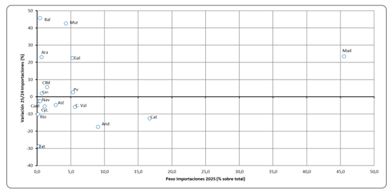 En el ámbito importador desde EE. UU., la concentración durante 2025 es aún mayor. Madrid absorbe el 45,5% del total y sus importaciones del país norteamericano crecen un 23,5%, convirtiéndose en el principal determinante del incremento a escala nacional (en el gráfico, Madrid se sitúa en el cuadrante superior derecho, característico de elevada cuota y fuerte crecimiento). Le siguen Cataluña (16,7%; -12,6%) y Andalucía (9,0%; -17,4%), ambas en situación de ajuste, mientras Galicia (5,2%; +22,6%) y Murcia (4,3%; +42,7%) aportan un impulso significativo. En este caso, el avance importador se explica menos por un aumento generalizado de las compras de las regiones a EE. UU. que por incrementos intensos en algunos territorios de destacado protagonismo en la vertiente importadora.