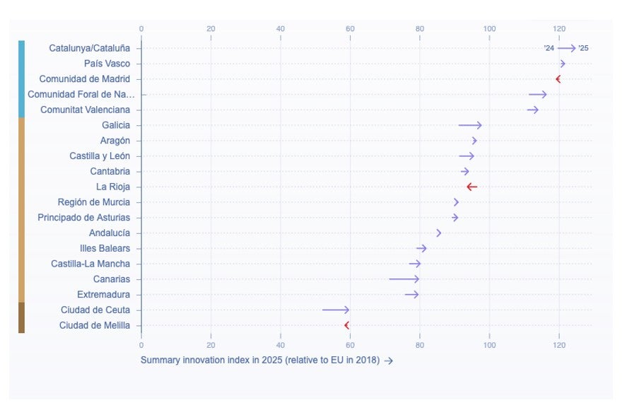 En el lado opuesto, Madrid, La Rioja y Melilla han experimentado un retroceso respecto a 2024. En el caso de Madrid, es posible que la relativa madurez del ecosistema innovador haga más difícil mantener tasas de crecimiento elevadas, a pesar de tener valores absolutos aún altos.
