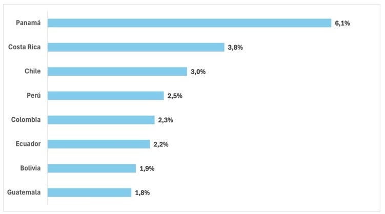 El turismo es considerado como una actividad de exportación invisible que genera divisas sin generar movimientos físicos de productos (Sinclair y Stabler, 2021; Dwyer, 2022). Desde esta visión, es importante señalar que el turista se comporta como un comprador que traslada su poder de compra al país receptor, encadenando efectos multiplicadores sobre la producción y el empleo (Rodríguez-Antón & Rubio-Andrada, 2016). Según la Figura 2, el aporte promedio del turismo al PIB en los ocho países fue de 3%; Panamá es el país con mayor porcentaje de participación de las actividades del turismo en la economía con un 6%. En cambio, en Costa Rica el aporte directo de las actividades relacionadas con viajes y turismo es de aproximadamente un 4% de su PIB. En Chile, Perú, Colombia y Ecuador la contribución de estas actividades a la economía está entre el 2 y 3%; finalmente en Bolivia y Guatemala este indicador no supera el 2%.