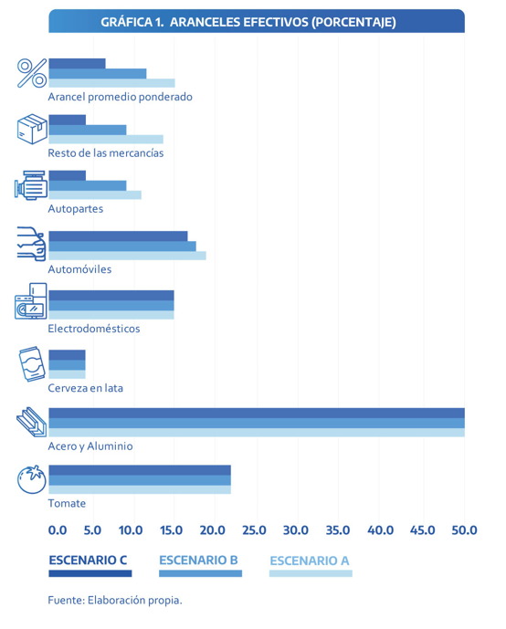 Para entender mejor el impacto, se plantearon tres escenarios que reflejan distintos niveles de integración bajo el T-MEC. El escenario A considera que el 47% de las exportaciones se realiza vía T-MEC (proporción similar a la registrada en 2024), el escenario B asume el mayor cumplimiento registrado de las reglas del tratado (66%) y el escenario C representa una situación muy favorable, con una participación aún más alta de exportaciones amparadas por el acuerdo (85%). A medida que aumenta la integración o cumplimiento del T-MEC, la carga arancelaria promedio disminuye, lo que reduce las afectaciones sobre la economía. En el gráfico 1 se presentan los aranceles efectivos aplicados al 20 de junio del 2025.
