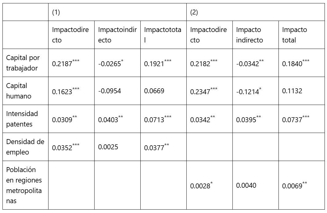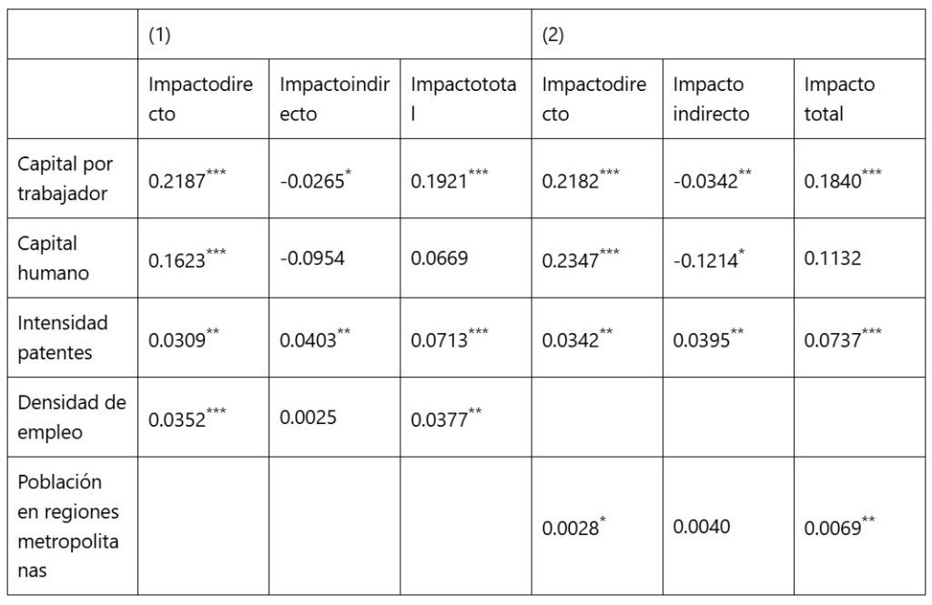 Respecto al capital humano, el impacto directo positivo se ve parcial o totalmente contrarrestado por un impacto indirecto negativo, denotando cierto tipo de rivalidad regional en el uso de este factor. Dado que los rendimientos de la inversión en capital humano son más elevados en las regiones aglomeradas (Gómez-Tello et al, 2025b), los trabajadores cualificados suelen sentirse atraídos por los salarios más altos y las mejores oportunidades laborales que ofrecen estas zonas. Esto genera el reto de retener en la región de origen al talento que allí se ha formado. Generar incentivos dirigidos a estos trabajadores altamente cualificados puede contribuir a corregir los desequilibrios territoriales, pero además deberían acompañarse del diseño de planes educativos orientados a fortalecer competencias específicas que complementen las dotaciones locales de recursos. La única forma de contrarrestar las externalidades espaciales de carácter negativo es hacer que el capital humano genere altos rendimientos en sus lugares de origen, y que los trabajadores obtengan remuneraciones más acordes con su productividad.