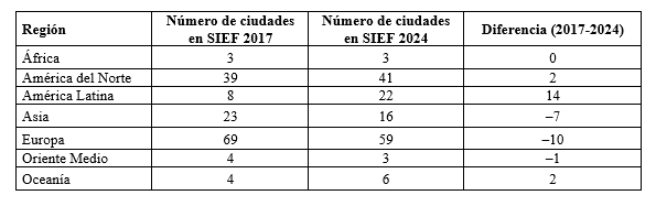 Al comparar SIEF 2017 y SIEF 2024 (Tabla 1) se observan continuidades: las grandes metrópolis siguen arriba, pero también una creciente descentralización simbólica. Europa mantiene fuerte presencia con ajustes internos; América del Norte muestra mayor policentrismo; y destaca el avance de América Latina, con más ciudades incorporándose al mapa global mediante festivales y eventos deportivos.