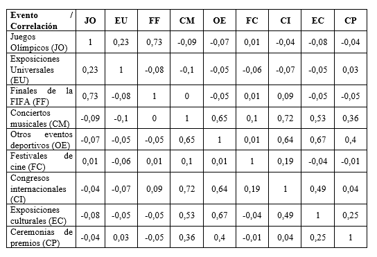 Tabla 2. Correlaciones entre las principales categorías de eventos: identificación de sinergias temáticas en el sistema urbano mundial. Fuente: elaboración propia.