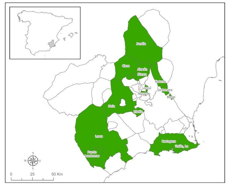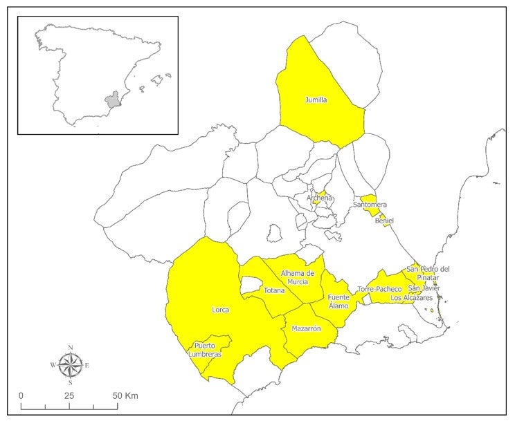 La población inmigrante (Figura 1) está muy relacionada con el sector de la agricultura intensiva, localizada en el Campo de Cartagena, el valle del Guadalentín y la vega media del río Segura. En números absolutos destacan los tres grandes municipios de Murcia, Cartagena y Lorca pero, en términos relativos son muy notables los efectivos en los espacios litorales de actividad agraria como Mazarrón (37% de origen inmigrante), San Javier, Los Alcázares, Torre Pacheco, San Pedro y Águilas.