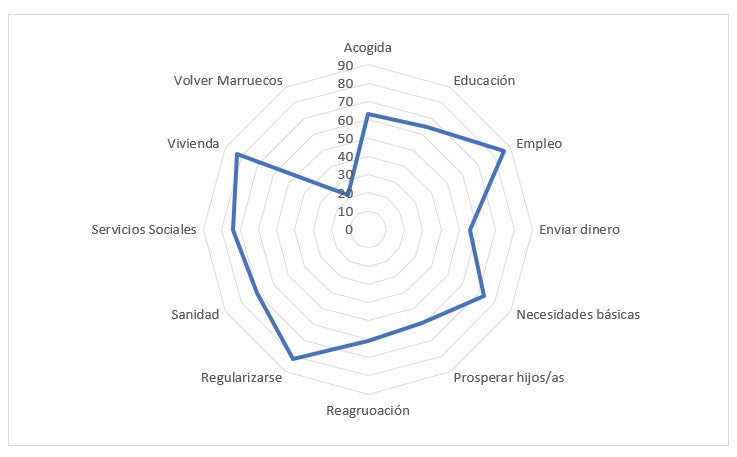 Las principales inquietudes de esta población inmigrante magrebí son regularizar su situación, encontrar un empleo estable, poseer una vivienda propia o de alquiler, tener cubiertas las necesidades básicas, acceder a los servicios sociales, poder reagrupar a sus familias y no sentirse rechazados. Con respecto a otras temáticas, no hay problemas en la escolarización de sus hijos, el envío de dinero a su país de origen y la práctica religiosa (Figura 3).