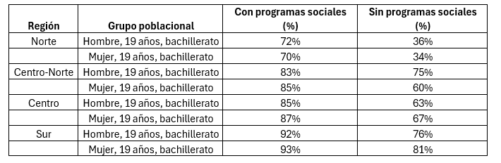 Finalmente, en la región sur, caracterizada por los mayores niveles de informalidad, las probabilidades alcanzan niveles aún más elevados. Un hombre joven con bachillerato que recibe programas sociales presenta una probabilidad de informalidad del 92%, frente al 76% si no los recibe. En el caso de las mujeres, estas cifras ascienden a 93% con apoyo y 81% sin apoyo.