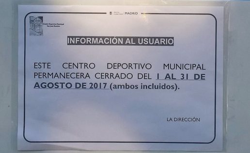 Cuál no sería mi sorpresa cuando ayer un triste cartel en la puerta me comunica que las instalaciones estarán cerradas durante todo el mes de agosto. Cojo el coche y abandono Ciudad Lineal para buscar otra piscina, esta vez pruebo en el distrito de Hortaleza. Cerrada. Lo intento con otra que conozco en Chamartín. Cerrada también. Por fin encuentro un polideportivo de gestión privada que tiene sus puertas abiertas, una hora después de haber iniciado mi periplo por las instalaciones municipales. Aunque, ojo, me avisan que por las tardes no hay acceso público, es solo para las clases de pago. Aliviada, pago mi entrada y accedo al recinto.