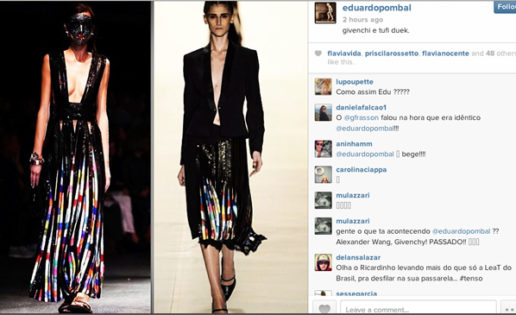 Minutos después del desfile de Givenchy, el diseñador brasileño Eduardo Pombal, colgó en su Instagram dos fotos de dos faldas plisadas muy similares con el comentario «Givenchy y Tufi Duek». Una era la del desfile que Ricardo Tisci acababa de presentar en ParÃs para Givenchy. La otra era un diseño de Pombal para la firma brasileña Tufi Duek, presentado en marzo 2013 durante la semana de la moda de Sao Paulo. Son casi idénticas.