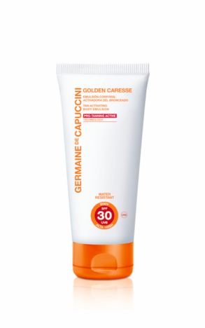 –Golden Caresse Emulsión Corporal activadora del bronceado Germaine de Capuccini, es un fotopotector con SPF 30 que se aplica durante la exposición solar, y lleva incorporada una tecnología patentada pro-pigmentante que refuerza el bronceado. 36€ en Institutos de Belleza y www.germaine-de-capuccini.com