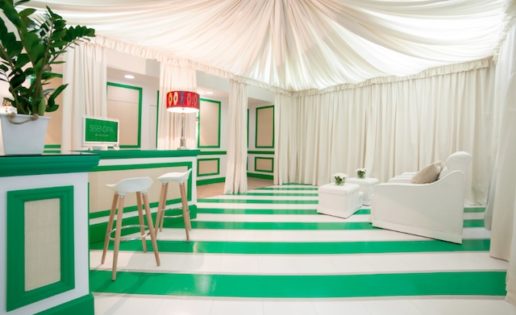Pero detrás de esta barra lo que hay es la recepción de un centro de belleza natural, decorado por Luis García Fraile (mi enhorabuena Luis!), y tras las molduras de las paredes y el papel de plantas tropicales, se esconden las las cabinas.