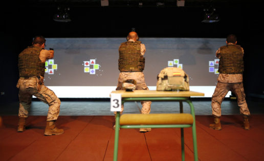 En la sala de simulación de tiro Victrix, donde algunos «guerrilleros» completan su instrucción con vistas a una misión cuyas principales amenazas pueden ser la volatilidad de la situación en el país y la especial violencia con la que se están empleando los dos grupos enfrentados, que recuerda a los conflictos que asolaron África en los 90.