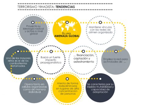 El terrorismo yihadista –que “ha asumido dimensiones cada vez mayores”- se sitúa como uno de los principales quebraderos de cabeza para seguridad nacional. Y con Daesh como “principal protagonista de esta amenaza”: por su capacidad operativa, medios, proyección mediática y rápida expansión se ha convertido en el referente del terrorismo yihadista.