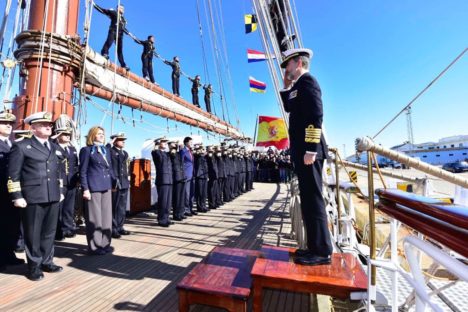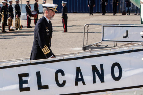 El acto ha tenido lugar a bordo del Juan Sebastián de Elcano, atracado en el Arsenal de la Carraca en San Fernando (Cádiz). Tras saludar a una representación de la dotación, ambos reyes firmaron en el libro de honor de este buque en servicio en la Armada Española desde 1928.