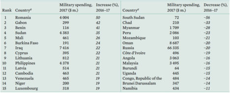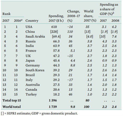 - China realizó el mayor incremento en gasto en 2017. Su gasto total es de 228.000 millones de dólares, un 5,6% más (12.000 millones de dólares más). Es el segundo país que más gasta.
