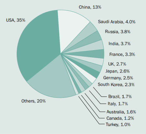 - Arabia Saudí escala por primera vez hasta la tercera posición del gasto global militar con un gasto de 69.400 millones de dólares.