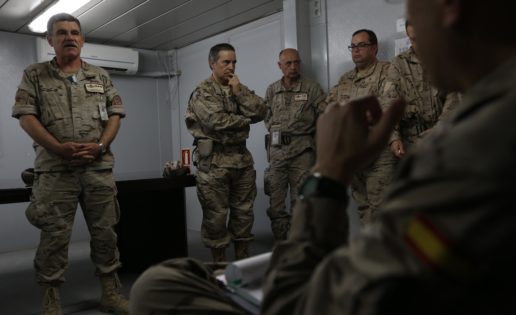 Nos esparcimos en la cafetería con conversaciones en torno al futuro de Afganistán. Hora de comer. Y elegimos un menú típicamente español: salmorejo cordobés y rabo de toro. Una botellita de agua y plátano como postre. A las cuatro de la tarde asistimos a una serie de charlas de los mandos españoles que realizan a los recién llegados. Tras ella, nos proveemos con el chaleco antibalas y el casco. Será nuestros inseparables compañeros fuera de la base y en los viajes “intrateatro”, con despegue y aterrizaje en Afganistán.