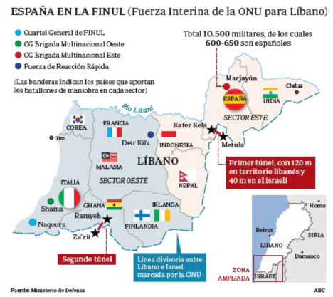 La noticia se dio a conocer el pasado 4 y 6 de diciembre, cuando el Gobierno de Israel informó, a bombo y platillo, sobre la existencia de los dos túneles entre las localidades de Ramyeh (Líbano) y Za’rit (Israel) y Kafer Kela (Líbano) y Metula (Israel), éste último en el sector Este, en la zona de control donde España despliega unos 600 militares.