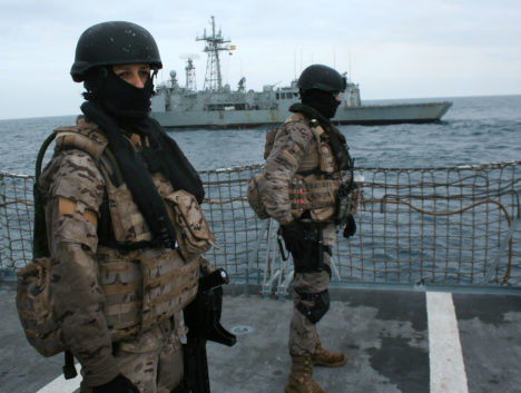 Tras una batida de reconocimiento del helicóptero SH-60 B de la fragata Victoria, una veintena de infantes de Marina españoles armados con fusiles de asalto abordan el buque con dos lanchas rígidas que alcanzan el buque rumano a gran velocidad.