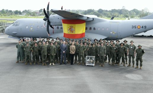 La ministra de Defensa, María Dolores de Cospedal, visitó este jueves el destacamento aéreo «Mamba», desplegado en Libreville (Gabón) con el objetivo de apoyar el transporte aéreo francés, de la UE y la ONU en la zona.