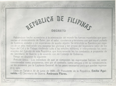 Mucho se ha escrito sobre «Los últimos de Filipinas», valga para destacar su gesta que el propio presidente de la República de Filipinas, General Emilio Aguinaldo, reconoció en su decreto de 30 de junio de 1899 que «aquel puñado de hombres aislados y sin esperanza de auxilio alguno, que habían defendido su bandera por espacio de un año, se habían hecho acreedores a la admiración del mundo por su valor, constancia y heroísmo, realizando una epopeya tan propia del legendario valor de los hijos del Cid y de Pelayo». Por ello, ordenó que no fueran considerados como prisioneros, sino como amigos, y que se les facilitara el regreso a España.