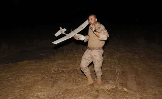 Asistimos a un ejercicio nocturno conjunto entre el Ejército español y el maliense. Son 36 malienses del 33 Regimiento Paracaidista con base en Bamako, antigua guardia presidencial, un regimiento de élite que se entrena ahora en una misión de extracción de un individuo ligado a Al Qaida de una vivienda. Todo el ejercicio será monitoreado desde la plataforma del Raven 11-B, cuyo zumbido al ser lanzado percibimos. Es uno de los usos que se le da a este avión no tripulado español («made in USA», por cierto) en MalÃ.