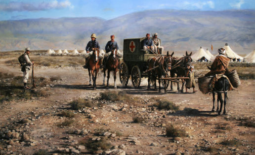 El cuadro del “pintor de batallas”, como es conocido Ferrer-Dalmau, confronta visualmente un carruaje de la farmacia militar española durante la contienda del Rif -también conocida como Segunda Guerra de Marruecos o Guerra de África- que se cruza con un rifeño a lomos de su burro. Otro autóctono guía el carruaje que parece aproximarse a un campamento militar español de tiendas cónicas, donde ondea la bandera nacional.
