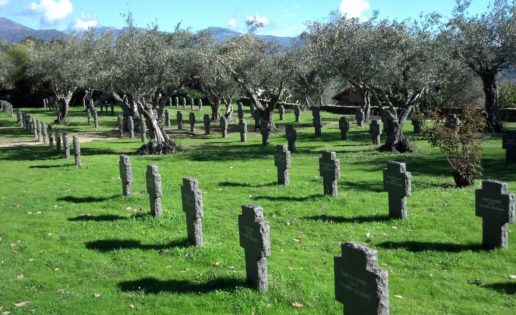 En este camposanto militar descansan 26 soldados de la Primera Guerra Mundial y 154 de la Segunda Guerra Mundial, se puede leer en la placa explicativa de un paraje enclavado en un pequeño olivar de la comarca de la Vera, famosa entre otras virtudes por su pimentón dulce: «Pertenecieron a tripulaciones de aviones que cayeron sobre España, submarinos y otros navÃos de la armada hundidos. Algunos de ellos murieron en hospitales españoles a causa de sus heridas. Sus tumbas estaban repartidas por toda España, allà donde el mar los arrojó a tierra, donde cayeron sus aviones o donde murieron. El Volksbund en los años 1980–1983 los reunió en esta última morada inaugurada en presencia del embajador de la República Federal de Alemania en un acto conmemorativo hispano-alemán el 1 de junio de 1983. Recordad a los muertos con profundo respeto y humildad».